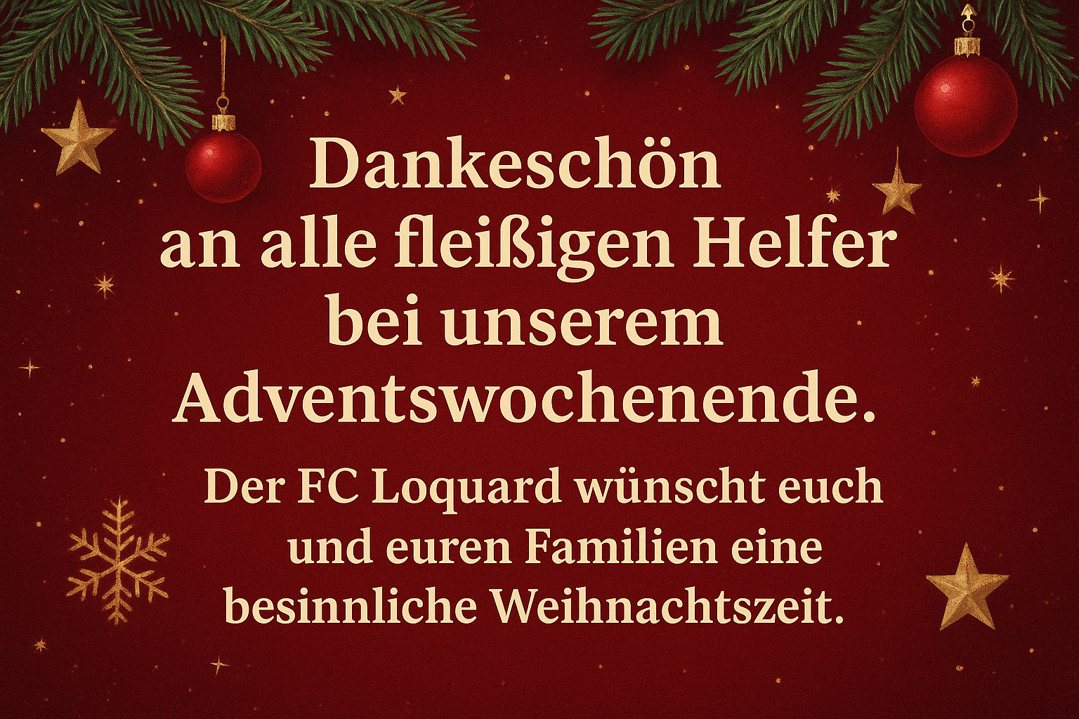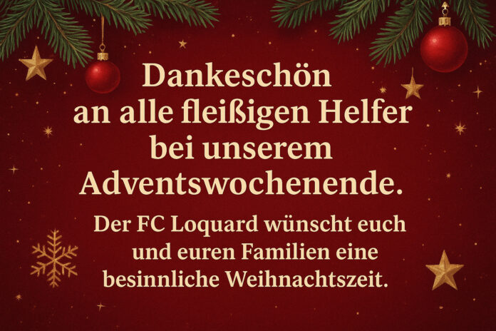 Aktuelles VereinWerbepartner Von Reiner Poets - 16. Dezember 2025 3 FacebookTwitterPinterestWhatsApp Der FC Loquard e. V. 1928 wünscht allen ein frohes, besinnliches Weihnachtsfest und ein guten Rutsch.