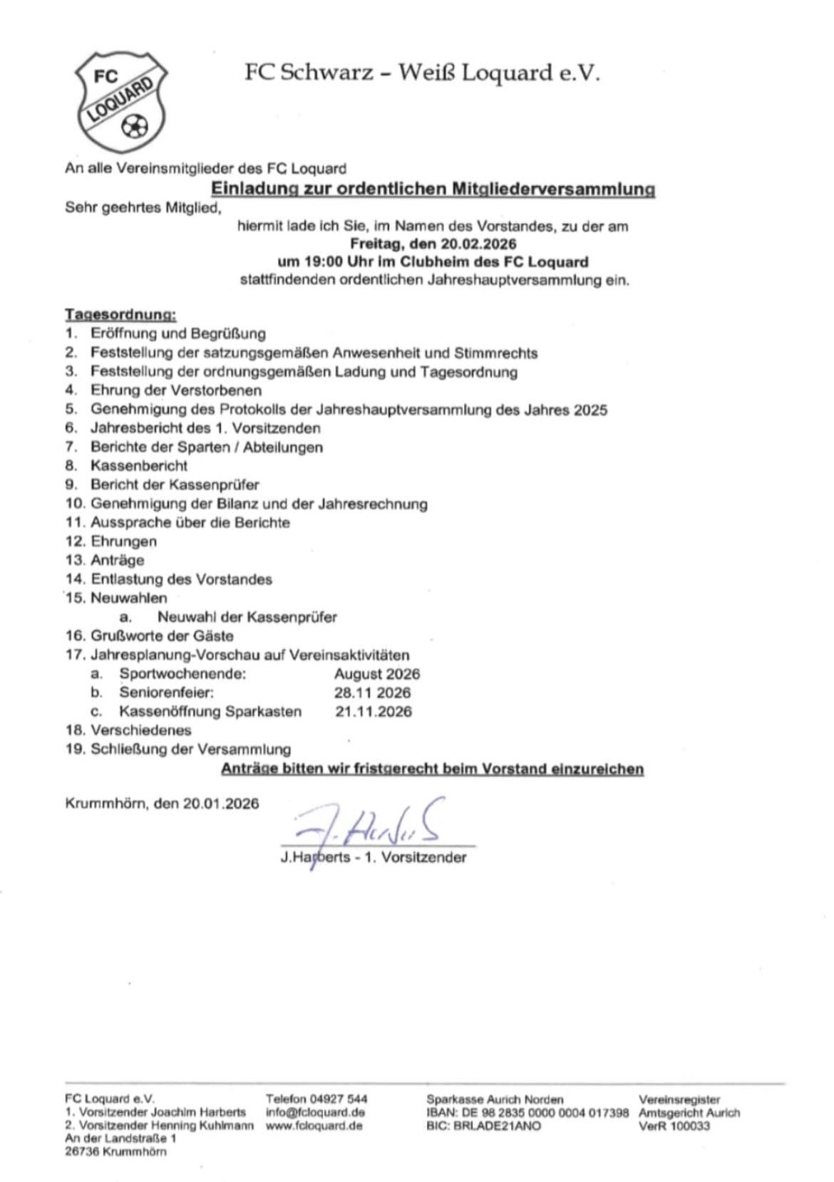 Aktuelles Verein Einladung zur Jahreshauptversammlung Von Thorsten Zeiß - 11. Februar 2026 3 FacebookTwitterPinterestWhatsApp Der Vorstand des FC Loquard lädt alle Mitglieder zur diesjährigen Jahreshauptversammlung am Freitag, den 20.02.2026 um 19:00 Uhr im Loquarder Clubheim ein.